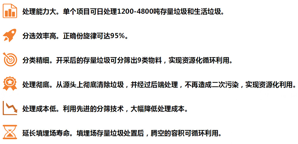 本技术通过彻底清除填埋垃圾,不再有污染产生,极大增强了周边居民的满意度,具备较高的社会效益,同时通过最优的设备、人力配置以及整合上下游处置企业,有效降低了分选和处置成本,具有较高的经济效益。